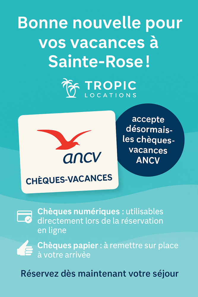 Bonne nouvelle pour les voyageurs ! Tropic Locations accepte désormais les chèques vacances ANCV pour vos séjours dans ses hébergements à Sainte-Rose (Île de La Réunion).